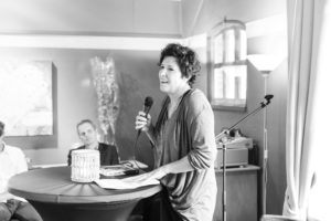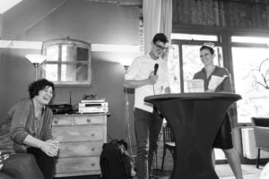 De zenuwen gieren inmiddels door mijn keel, mijn mond trilt, klamme handjes. We zijn bijna compleet, nog 2 mensen missen. Michiel, zwager en uitgever van mijn boek, is gastheer deze avond en maant iedereen naar voren te komen en plaats te nemen, het officiële gedeelte gaat nu toch echt beginnen! Slik