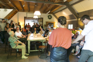 Noortje, mijn steun tijdens het schrijven, en Annemieke, mijn schoonzus, spreken mooie woorden. Bijzonder om dit allemaal te horen. De volgende. Babette. Die zou toch niets zeggen? Ik gloei van trots. En dan Peter, onze voorganger en verantwoordelijk voor het geestelijke stuk van de avond! Zegen over ons en zegen over mijn boek.  Jan sluit de rij sprekers af. Lieve en eerlijke woorden.